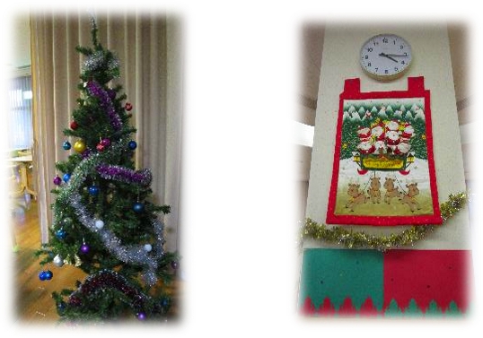 しおさい荘では、クリスマスの飾りつけをし、お部屋の中が華やかになりました。