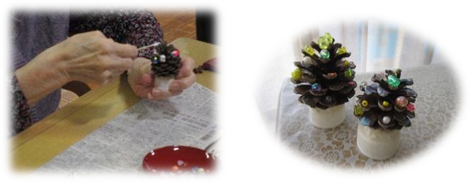 創作レクでは、「まつぼっくりのクリスマスツリー」を作成しました。